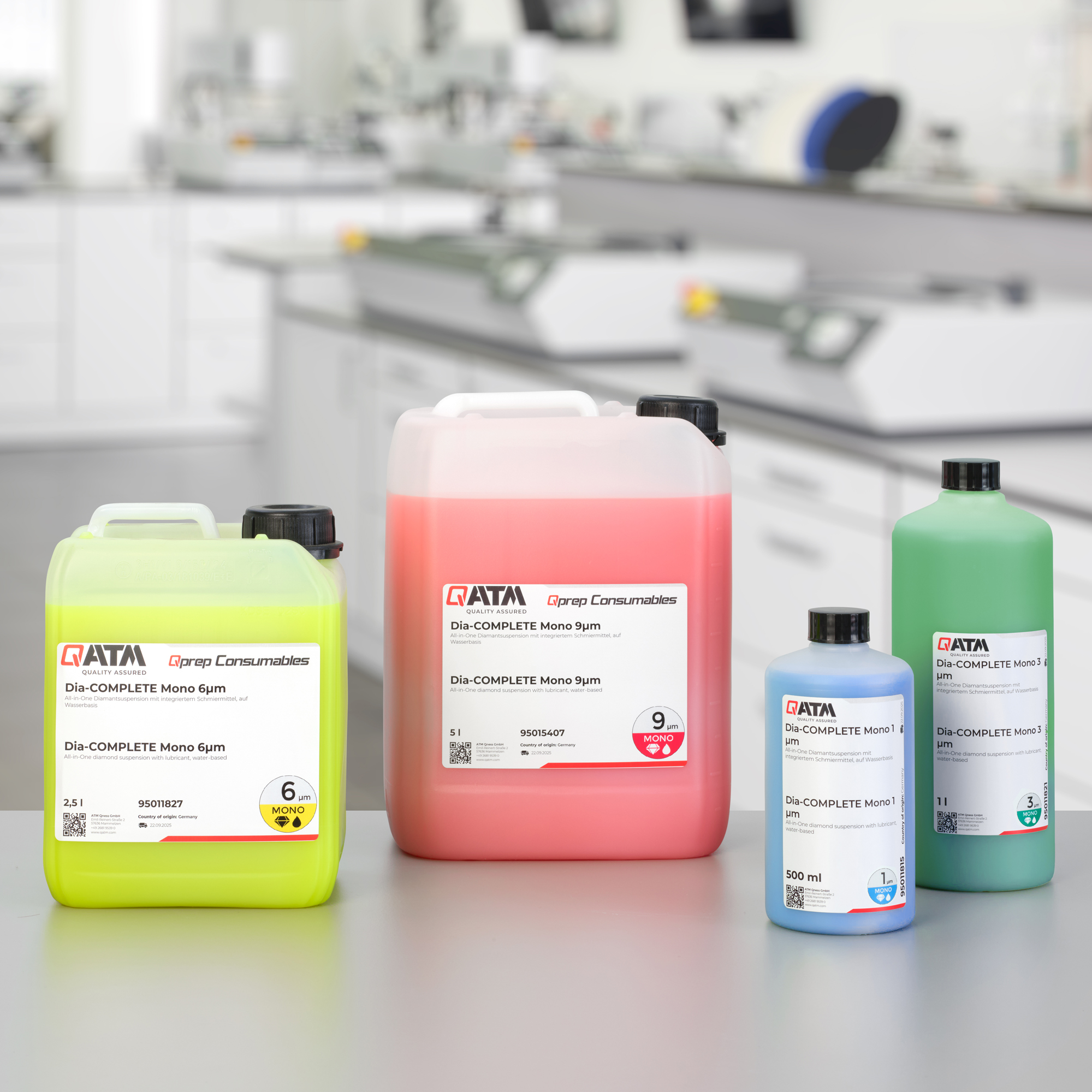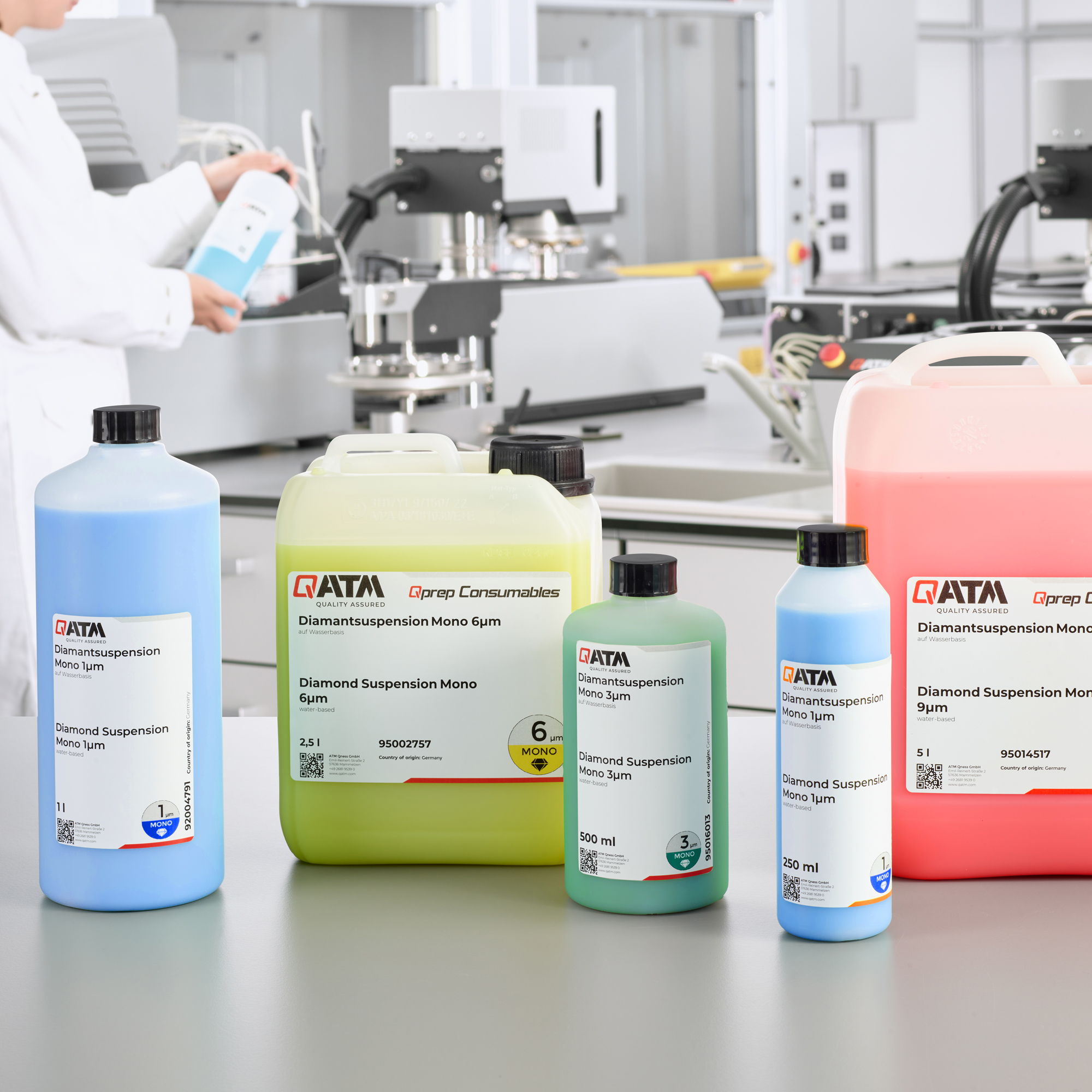 - QPREP diamond suspensions are used in combination with a lubricant based on water, alcohol, or oil. The right mixing ratio between suspension and lubricant must be observed to achieve correct polishing results. Alternatively, QATM offers the QPREP Dia-COMPLETE All-In-One diamond suspension. It contains the lubricant in an optimized ratio, which eliminates the need for manual dosing and mixing of suspension and lubricant.