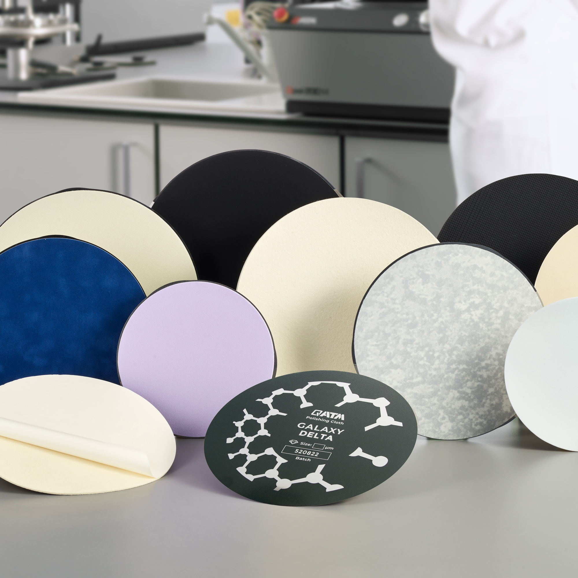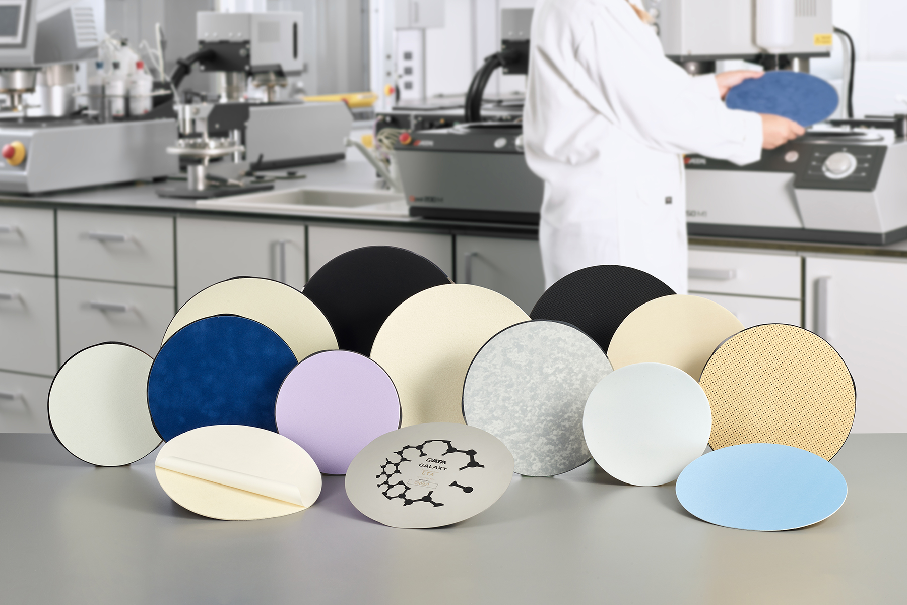 For a deformation- and relief-free polishing result, choosing the right polishing cloth is crucial. The cloth material and texture (silk, artificial silk, synthetic fibers, wool fabric, felt, flocked or foamed synthetic fabrics) and the resulting impact elasticity play a decisive role in the selection of the suiting polishing cloth. The fastening systems (GALAXY metal disc with magnetic foil or GALAXY X-Tap) also differ, and can influence the polishing result. The GALAXY polishing cloths, optimized with the QPREP anti-slip backing, withstand high shear forces even under high contact pressures and fully loaded sample holders, ensuring a stable polishing process at all times.